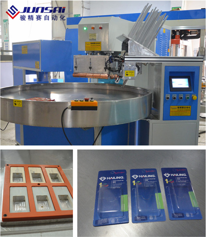 2. 用于吸塑包裝封口的高周波機器,使用時可根據(jù)吸塑包裝的產(chǎn)品尺寸大小,來決定一次同時包裝一個或多個產(chǎn)品。工作臺自動旋轉(zhuǎn),3-6工位可選擇,工作效率更高。